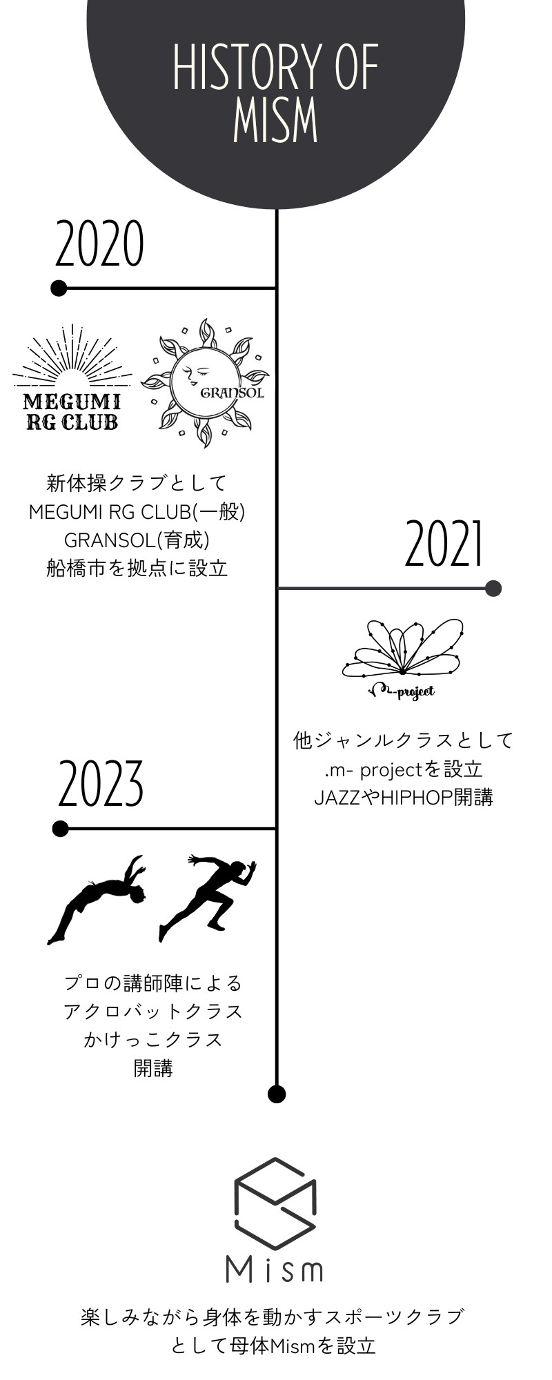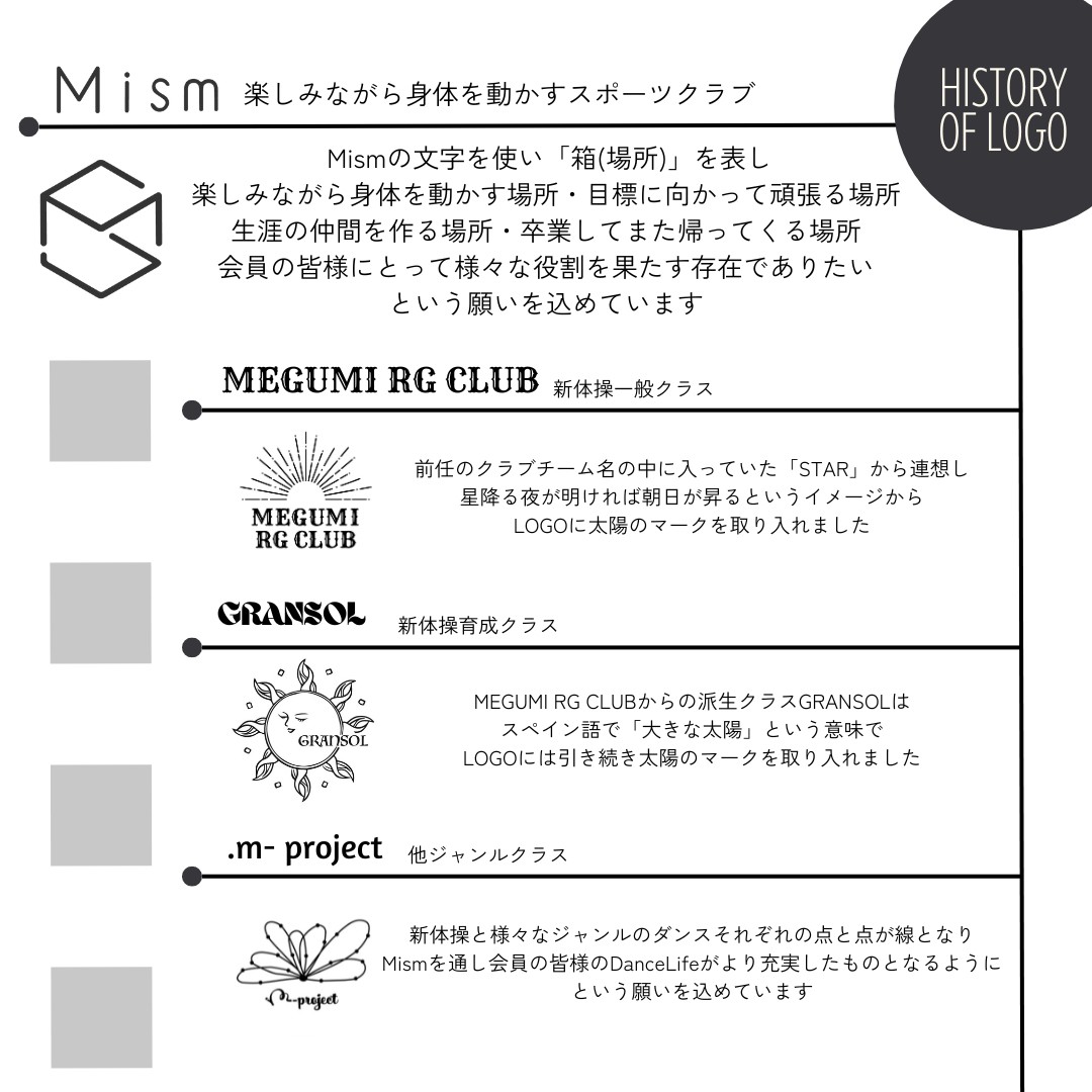 新体操クラブを原点にMism(エムイズム)が発足され団体名の由来は代表の[めぐみism]から名づけられました。